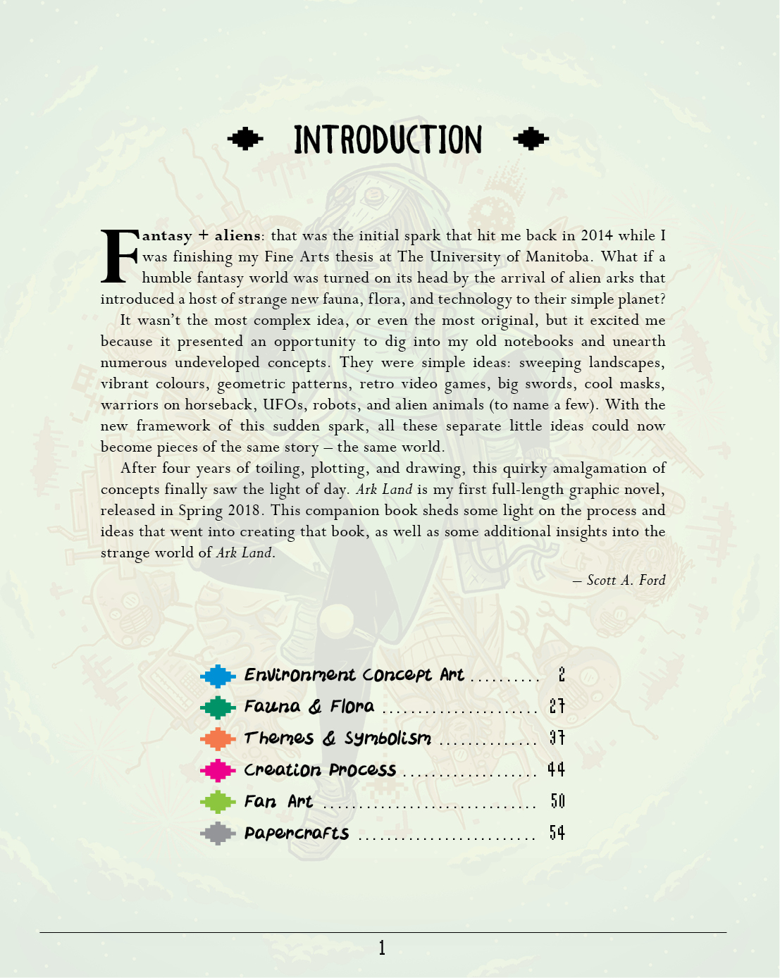 A companion book to the 2018 scifi fantasy graphic novel, Ark Land. This book includes: detailed descriptions of the creation process, an alien bestiary of all the fictitious fauna and flora, all original landscape concept art, in-depth breakdown of Ark Lands themes and symbols, sketchbook excerpts, amazing fan art from some Ark Land fans.