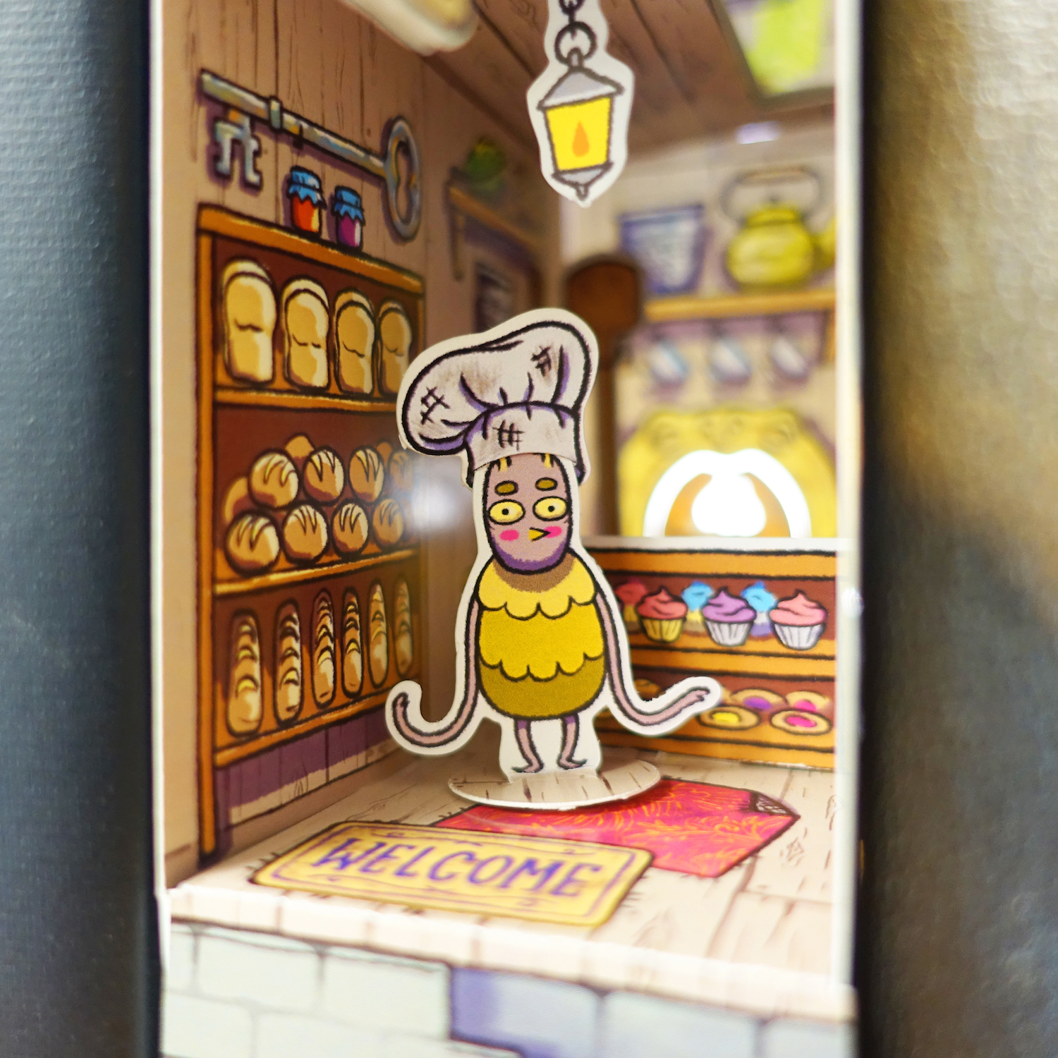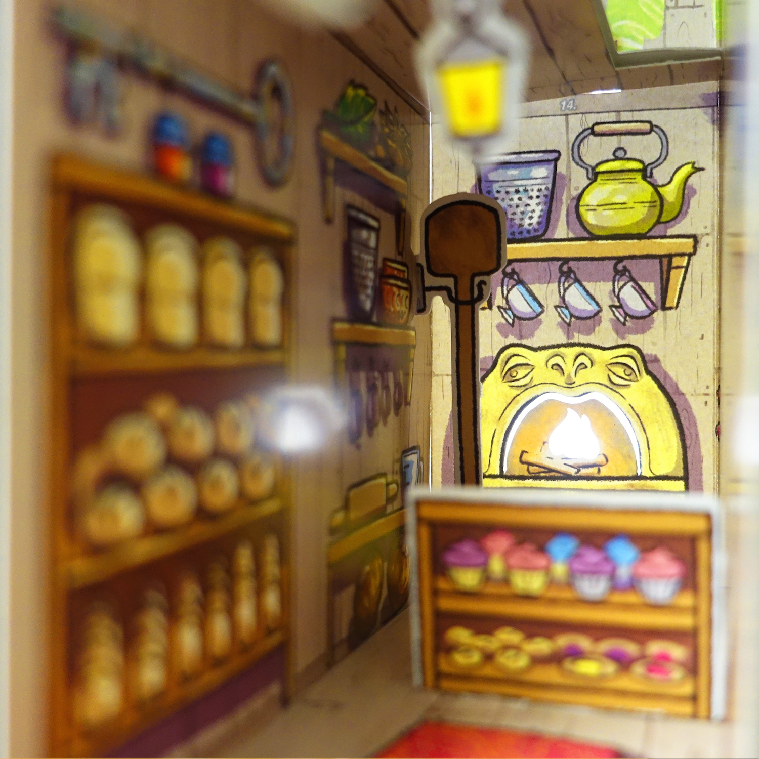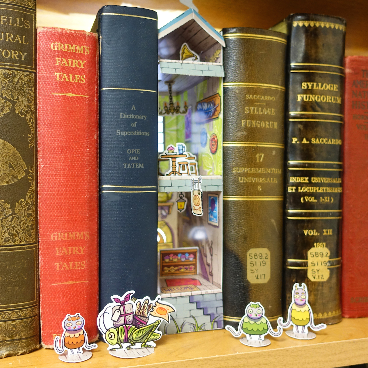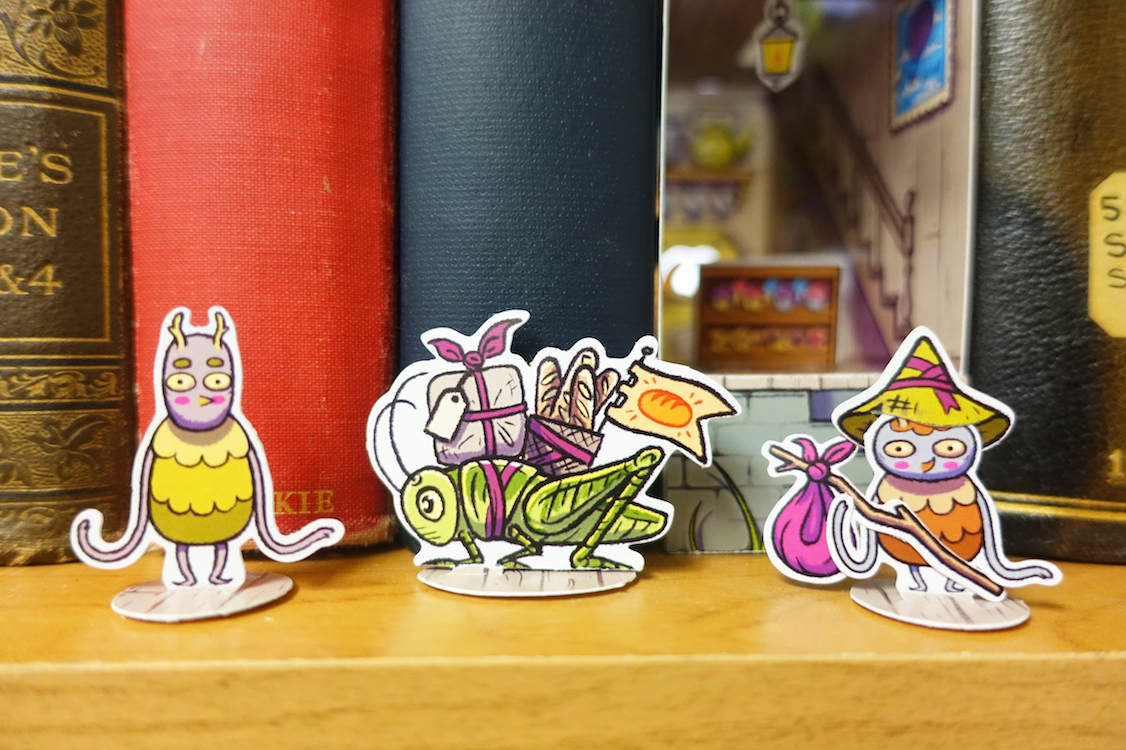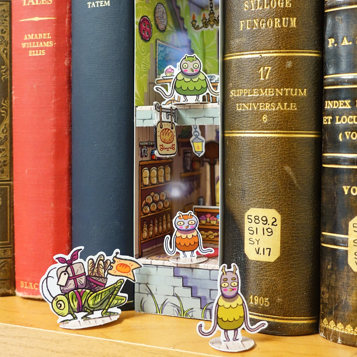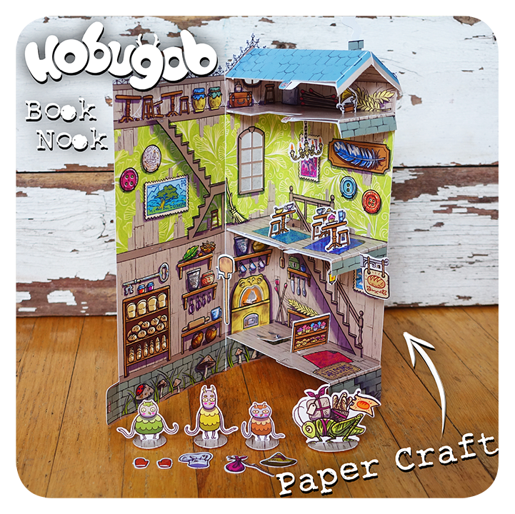 Assemble your own miniature bakery for little Hobugobs! A paper craft diorama that hides on your bookshelf. No glue, tape or scissors, required!